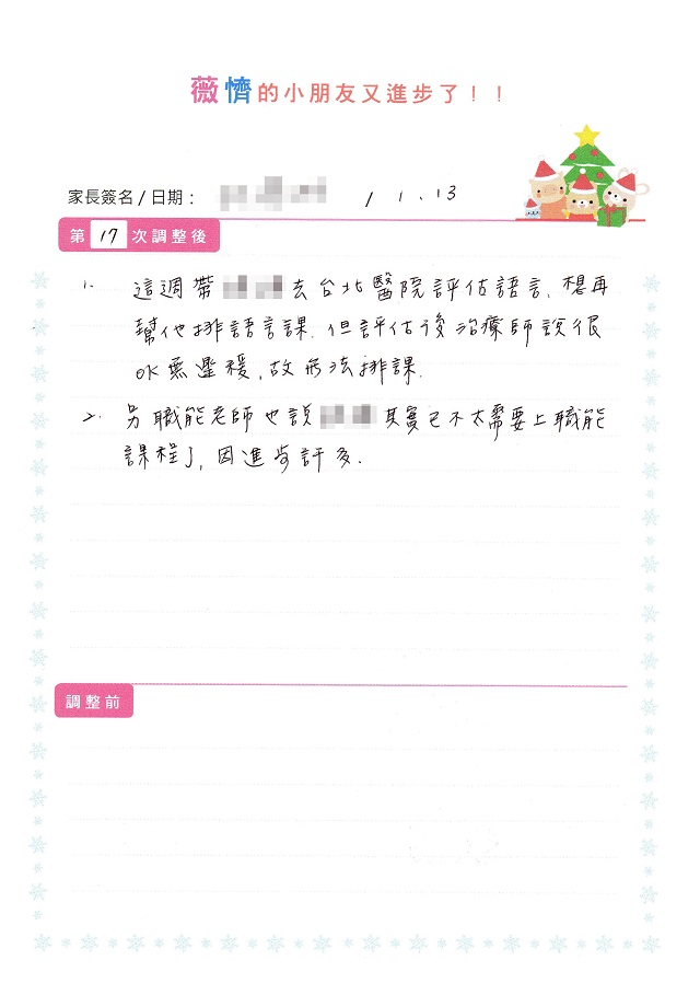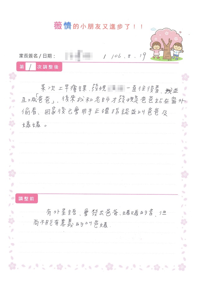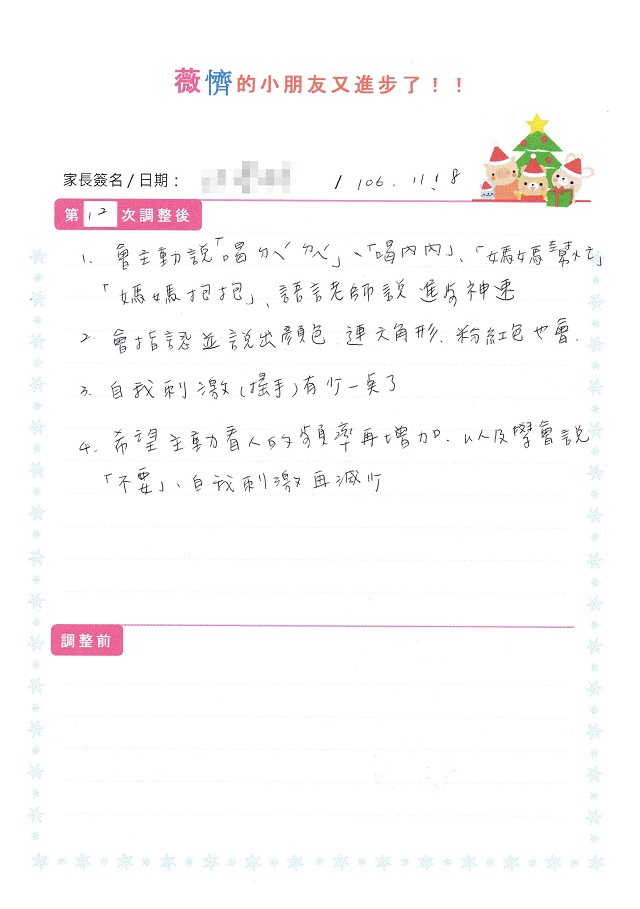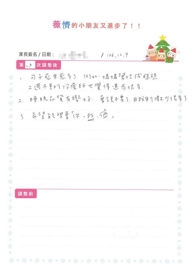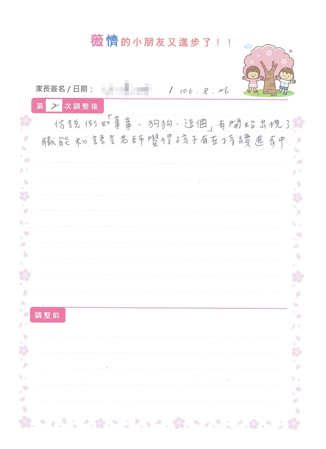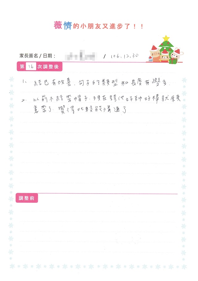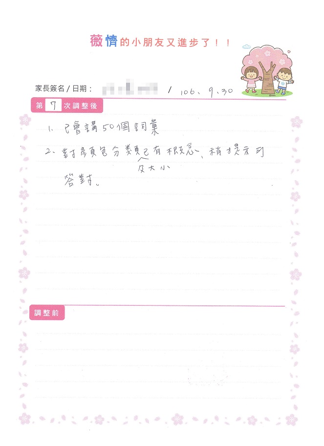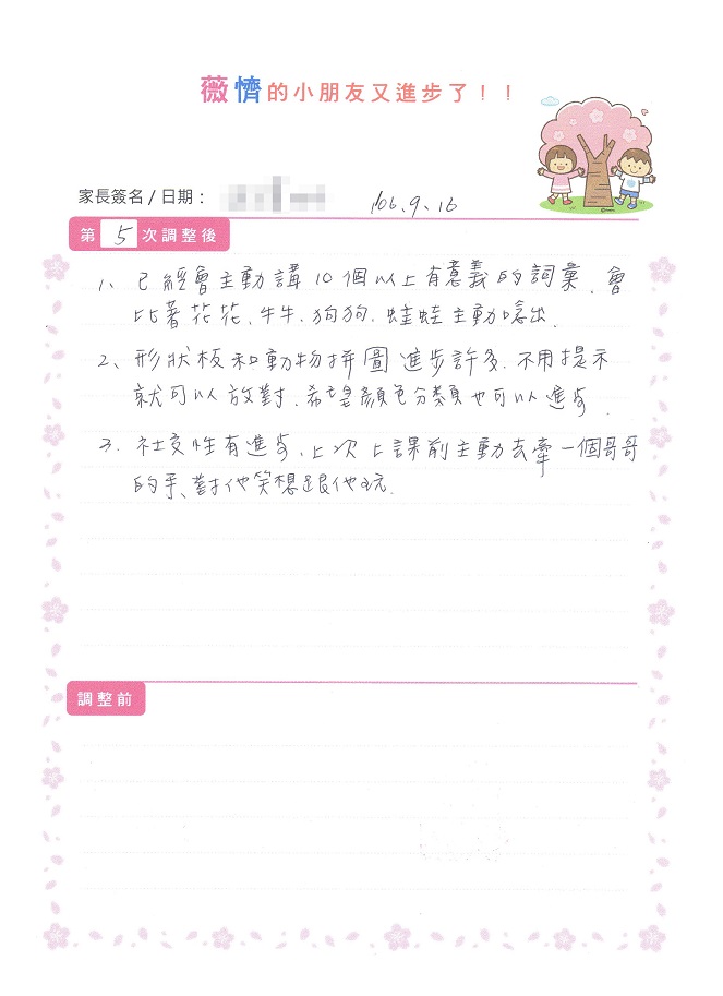 之後哥哥的語言及認知進展一直持續進步,我們做完第一個課程時,已會說短句,認知方面,哥哥的形狀、顏色方面的認知,被政大教授說已達3歲以上的程度,治療師也說他進步神速。我和先生也決定繼續讓哥哥上課程,謝謝老師的幫忙!!
